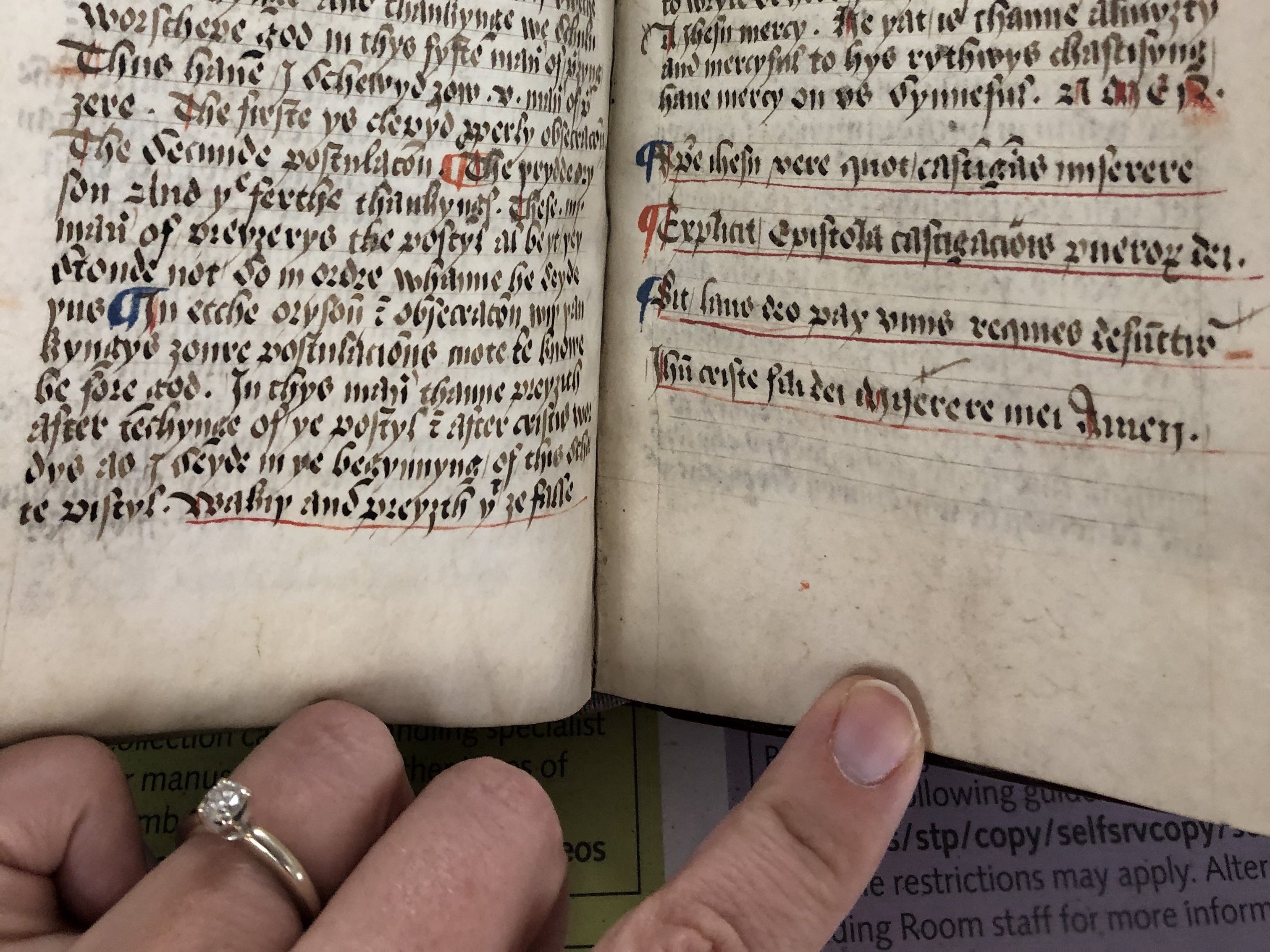 The impact of that trip is still sinking into my heart and mind. But one of the things that has stuck with me is the feel, texture, smell of reading handwritten parchment. I only had three mornings at the British Library, and only one full day at the Bodleian. So I had stacks of manuscripts, taking three at a time, from a list that felt dreamlike when I was composing it. All of a sudden, all was real. Each scribe’s varying hand and conventions, each different pen, changing textured animal skin, and of course the content, the paragraphs and all the little scribal mistakes and doodles and manicules pointing towards something important, all color and fulfill the reading and thinking experience. Generalities do not exist, really. Only particulars.